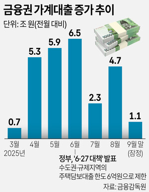 ‘6·27 대출 규제’와 비(非)이사철 수요 감소 등으로 지난달 전체 금융권 가계대출 증가 폭이 1조원대로 급감했다.한국은행이 16일 발표한 ‘금융시장 동향’에 따르면 9월 말 기준 예금은행의 가계대출(정책모기지론 포함) 잔액은 8월 말보다 2조원 많은 1170조2000억원으로 집계됐다. 지난 6월 6조2000억원에 이르던 가계대출 증가 폭은 6·27 대책 이후 7월 2조7000억원으로 줄었다가 8월 4조원대로 반등했지만, 9월에 다시 절반 수준으로 축소됐다.대출 종류별로는 전세자금 대출을 포함한 주택담보대출(932조7000억원)이