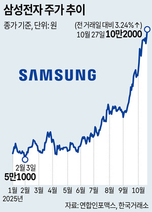 ‘500만 국민주’ 삼성전자의 주가가 27일 사상 처음으로 10만원을 돌파했다. 반도체 업황 회복에 대한 기대감과 살아나고 있는 고대역폭 메모리(HBM) 경쟁력, 주가 부양을 위한 자사주 매입 노력 등이 맞물린 결과다. 특히 최근 테슬라, 애플, 오픈AI 등 글로벌 기업들과의 협력 성과를 끌어낸 점도 주가 상승에 영향을 준 것으로 분석된다.27일 한국거래소에 따르면 이날 삼성전자 주가는 전장 대비 3.24% 오른 10만2000원으로 거래를 마쳤다. 시가총액은 603조8000억원을 기록했다. 삼성전자 주가가 10만원을 넘어선 것은 사