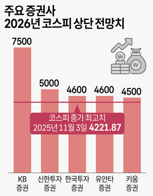 코스피가 조정 뒤 상승세로 돌아선 가운데 주요 증권사들이 내년 코스피 전망치로 4500에서 7500을 제시했다. 증권사 간 낙관과 신중론이 극명히 엇갈리는 모습이다.11일 증권업계에 따르면 국내 증권사 중 KB증권이 내년 코스피 최고치를 7500포인트로 가장 높게 제시했다. KB증권은 보고서에서 "현재 ‘3저 호황(저달러·저유가·저금리)’ 시기였던 1984년과 유사한 상황으로, 이번 강세장은 단순한 경기 반등이 아니라 40년 만에 재현되는 장기 상승 국면의 시작일 가능성이 높다"며 "앞으로 7500포인트까지 상승할 수 있다"고 짚었