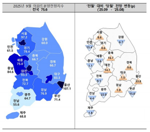 고강도 대출규제를 담은 ‘6·27 부동산 대책’ 영향으로 지난달 큰폭 하락했던 전국 아파트 분양전망지수가 이달 소폭 상승했다.주택산업연구원(주산연)은 지난달 20∼29일 주택사업자를 대상으로 설문한 결과, 9월 아파트 분양전망지수는 75.6으로 전월 대비 0.5포인트(p) 올랐다고 9일 밝혔다. 앞서 지난달 전망지수는 6·27 대책 영향이 반영되면서 7월(97.0) 대비 21.9p 하락했다. 분양전망지수가 100을 넘으면 분양 전망을 긍정적으로 보는 사업자가 더 많고, 100 미만이면 그 반대 상황이라는 의미다.수도권 전체(81.4