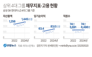 최근 3년간 삼성·SK·현대차·LG 등 상위 4대그룹의 자산총액과 순이익이 늘었으나 직원 수는 정체 상태인 것으로 파악됐다.20일 리더스인덱스가 자산 기준 30대 그룹과 4대 그룹의 자산총액·매출액·당기순이익과 직원 수 3년 추이를 비교 분석한 결과 이같이 나타났다. 4대 그룹의 자산 총액은 2022년 1255조7050억원, 2023년 1360조454억원, 2024년 1444조7580억원으로 3년간 15% 증가했다. 2019년 1000조원을 돌파한 이후 꾸준한 증가세를 이어가며 작년에는 사상 최대치를 경신했다. 30대 그룹 전체 자