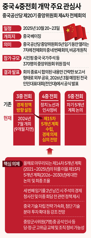 앞으로 5년간 중국의 경제정책 방향을 제시할 중국공산당 제20기 중앙위원회 제4차 전체회의(4중전회)가 20일부터 나흘간 중국 베이징에서 개최된다. 이달 말 미·중 정상회담을 앞두고 양국 간 관세전쟁 긴장감이 높아지는 상황에서 중국이 내수 부진과 부동산 침체 속 경기 리스크 확대 등 ‘내우외환’ 상황에 어떤 대응 방안을 내놓을지 관심이 쏠린다. 4중전회는 중국 공산당 중앙위원회 5년의 임기 동안 열리는 7차례의 전체회의 중 네 번째 회의를 의미하며, 시진핑 중국 국가주석을 비롯한 370명의 중앙위원회 위원들이 참석한다.이번 회의의