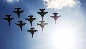 15일 경기도 성남시 상공에서 공군 특수비행팀 블랙이글스가 오는 17일부터 사흘간 서울공항에서 열리는 서울 국제 항공우주 및 방위산업 전시회(ADEX) '퍼블릭 데이'를 앞두고 사전 연습을 하고 있다.