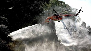 22일 충남 공주시 공산성 일대에서 열린 2025년 산불진화 통합훈련에서 헬기가 투입돼 공중 진화 시범을 보이고 있다.