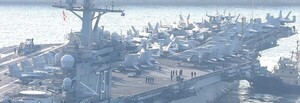 미국 해군 7함대 소속 핵 추진 항공모함 '조지워싱턴함'(10만t급)이 5일 오전 군수적재 및 승조원 휴식 등을 위해 부산 남구 해군작전사령부 부산기지에 입항하고 있다. 니미츠급인 이 핵항모는 길이 333m, 폭 76.8m, 비행갑판 면적은 축구장 3배 규모이며, 승조원은 6000여 명이다.