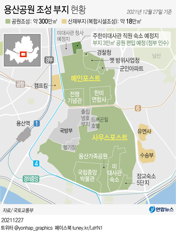 용산공원 북측에 들어설 예정이었던 주한 미국대사관 직원 숙소가 공원 밖으로 이전하면 용산공원은 303만㎡ 규모로 더 넓어질 수도 있다. 다만 용산공원 부지 한복판의 미군 드래곤힐호텔(8만4000㎡)과 헬기장(5만7000㎡) 등은 공원 구역에 포함되지 못했다.