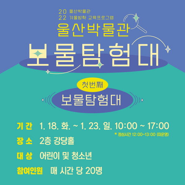 울산박물관의 겨울방학 교육프로그램 ‘보물 탐험대’가 시작된다(18일~23일). 어린이 및 청소년 대상이다. 울산박물관의 대표 유물과 관련된 체험활동으로 구성되며, 매일 매일 다르게 꾸며진다. 6일간 하루 총 6차례, 회당 20명씩 참여 가능하고 현장에서 선착순 접수한다. 참가자들은 탐험대가 되어 박물관 내의 울산 보물을 찾아 나서, 정답을 완성하면 울산박물관 체험 교구 꾸러미를 선물로 받는다(선착순 200명). 체험 후기를 SNS에 게재한 30명을 선정해 3월 가족 교육프로그램의 교구를 제공할 예정이다.