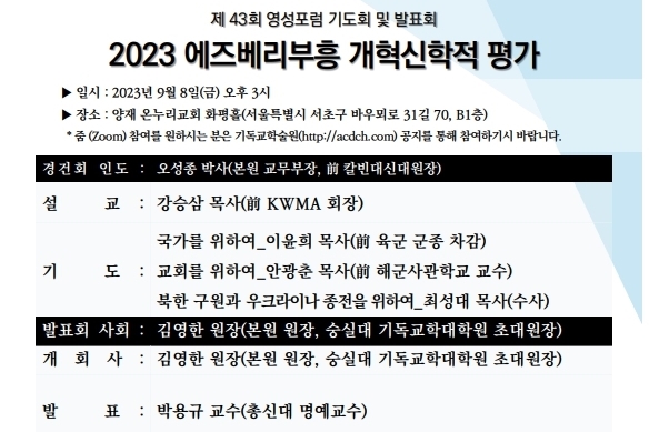 기독교학술원(김영한 원장)은 오는 9월 8일 오후 3시 서울 서초구 소재 양재 온누리교회 화평홀에서 ‘2023 애즈베리부흥 개혁신학적 평가’라는 주제로 제43회 영성포럼 기도회 및 발표회를 연다고 29일 밝혔다.