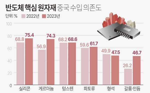 대표적으로 실리콘웨이퍼를 만드는 실리콘의 중국 수입 의존도는 2022년 68.8%에서 지난해 75.4%로 늘었다. 반도체 핵심 투입물 주재료의 4분의 3을 중국에 기댄 것이다. 같은 기간 반도체 연마재에 쓰이는 희토류는 61.7%로 2.1%포인트, 반도체 금속 배선 원료인 텅스텐은 68.6%로 0.4%포인트 의존도가 높아졌다. 아울러 차세대 화합물 반도체에 사용되는 게르마늄은 74.3%로 17.4%포인트, 갈륨과 인듐은 46.7%로 20.5%포인트 각각 상승했다. 6대 반도체 핵심 원자재 가운데 불화수소의 원료인 형석만 47.5%로 2.4%포인트 하락했다.