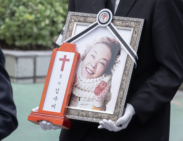 유족은 이날 오전 11시 서울 성동구 한양대병원 장례식장에서 고인과 가까운 지인, 동료 연예인들이 모인 가운데 김수미의 발인식을 엄수했다. 고인은 장례식장 앞에 모인 여러 지인과 동료의 배웅을 받은 뒤 장지인 경기 용인공원 아너스톤으로 향했다. 유족의 손에 들린 영정사진 속에서 고인은 생전의 유쾌하고 밝았던 모습 그대로 해맑은 미소를 짓고 있었다. 영화 ‘그대를 사랑합니다’(2011년) 포스터에 쓰인 사진이다.