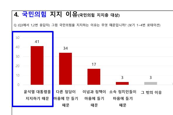 국민의힘 지지율 상승 이유가 국민의힘 소속 정치인 또는 이념·정책이 마음에 들어서라기 보다는 ‘윤 대통령에 대한 지지’와 ‘다른 정당(더불어민주당)에 대한 반감 효과’ 때문이라고 지지자 4명 중 3명이 응답한 셈이다.