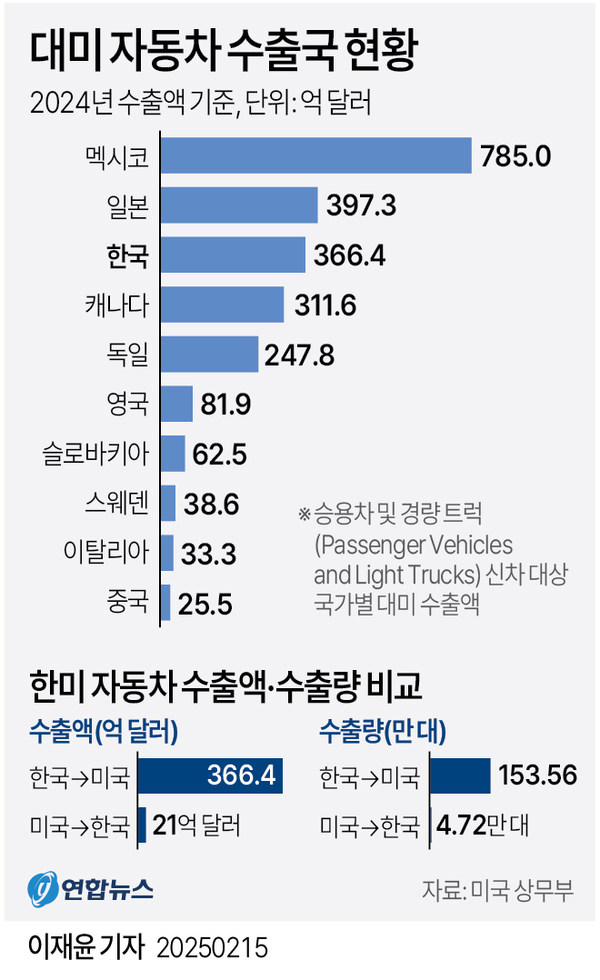 한편 지난해 한국의 연간 수출은 6838억 달러로 전년 보다 8.2% 증가하며 역대 최대치를 기록했다. 반도체는 인공지능(AI) 열풍을 타고 역대 최대 실적인 1419억달러를 기록하며 전체 수출의 20% 이상을 책임지는 견인차 역할을 했다. 자동차는 세계적인 전기차 캐즘(Chasm·일시적 수요 정체) 속에서도 2년 연속 700억달러 이상을 달성하며 전체 수출의 10% 이상을 담당했다. 미국 수출 중 이들 두 품목의 비중이 35%에 이르고 있어, 반도체와 자동차에 대한 폭탄 관세 부과시 정부가 세운 올해 수출목표 7000억 달러도 차질이 불가피할 전망이다.
