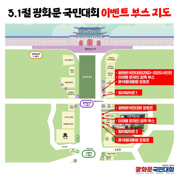 한편 오늘 3·1절 광화문 국민대회에서는 다양한 포토존 설치 등 이벤트도 진행된다. 이번 이벤트는 대통령 탄핵 심판이라는 절체절명의 순간에 탄핵반대 운동을 더 많은 국민들에게 알리기 위해 기획됐다.
