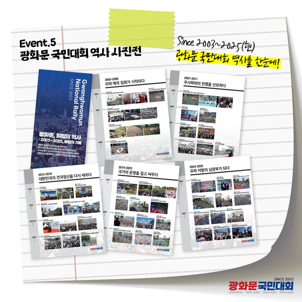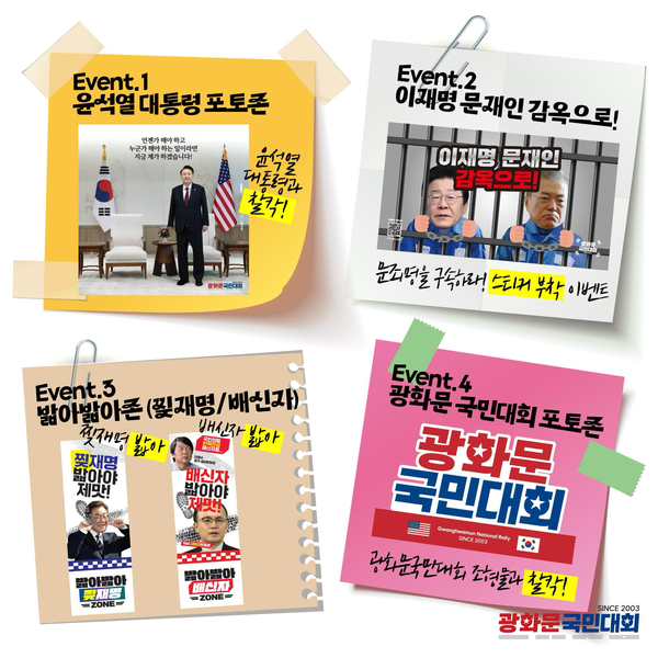 대국본은 '윤석열 대통령 포토존'과 '이재명 문재인 감옥보내기 포토존', '밟아밟아 포토존' 등을 통해 탄핵 정국을 둘러싼 국민 감정과 반대 여론을 여실히 담아낼 계획이다. 또한 '광화문 국민대회역사 사진전'을 통해 2003년 '효순이 미순이 사건'때부터 좌파 선동과 보수정권 흔들기에 맞서온 광화문 국민대회의 역사를 홍보할 예정이다.