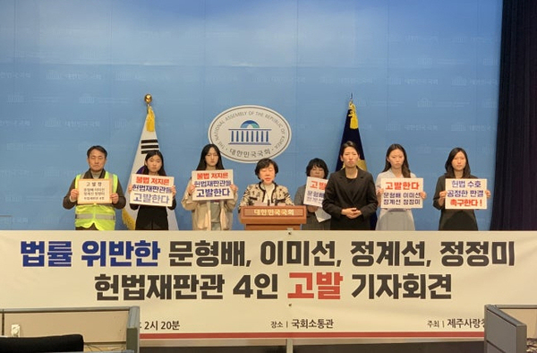 제주사랑청년연합회가 지난 11일 서울 여의도 국회소통관에서 기자회견을 갖고, "자유민주주의 대한민국의 법치국가의 기초를 무너뜨리고 있는 문형배, 이미선, 정계선, 정정미의 직권남용죄 형법 123조의 혐의를 고발한다"고 밝혔다.