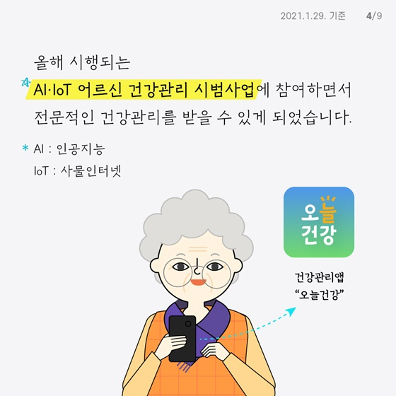 만성질환 관리나 식생활 개선이 필요한 65세 이상 어르신에게 스마트폰과 연동된 손목형 활동량 측정계와 체중계·혈압계·혈당계·AI 스피커 등을 제공하고, 수집된 정보를 전문가가 주 1회 분석해 맞춤형 관리 서비스를 제공하는 방식이다.