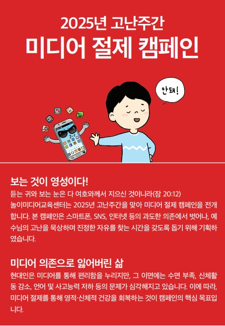 (사)놀이미디어교육센터(이사장 권장희)는 ‘미디어 절제 캠페인’을 통해 성도들이 고난주간 동안 영적으로 집중하고 가정과 개인이 하나님과의 관계를 점검하는 계기를 갖도록 제안했다.