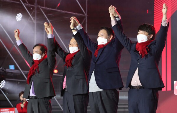 김종인 국민의힘 총괄선대위원장도 연설에서 "대한민국을 능력도 책임감도 부끄러움도 없는 이 정권에 맡겨놓을 수 없다"며 "국민의 힘을 보여줄 때"라고 강조했다.