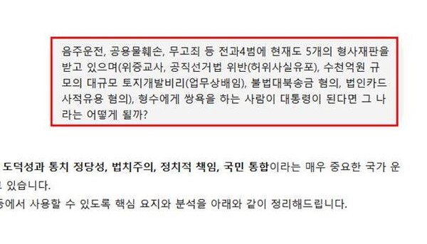 이어 '2. 도덕성 문제-공적 리더십의 붕괴'에서는 "음주운전, 무고, 공용물 훼손, 욕설 등은 일반 국민조차도 비판받는 행위"라며 특히 '형수에게 쌍욕'을 한 사실은 "국민적 정서와 윤리의 기준을 심각하게 췌손"이라고 평가했다. 그러면서 "도덕적 권위가 없는 지도자는 외교, 군 통수, 갈등 조정에서 설득력을 갖기 어려움"이라고 분석했다.