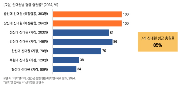 2024년 기준 7개 주요 신학대학원 중 총신대와 장신대를 제외한 대부분이 정원 미달 상태이며, 평균 충원율은 85%에 그쳤다. 이는 부교역자 수급에 직접적 타격을 주고 있으며, 86%의 담임목사들이 "부교역자 청빙이 앞으로 더 어려워질 것"이라고 비관적으로 전망했다.
