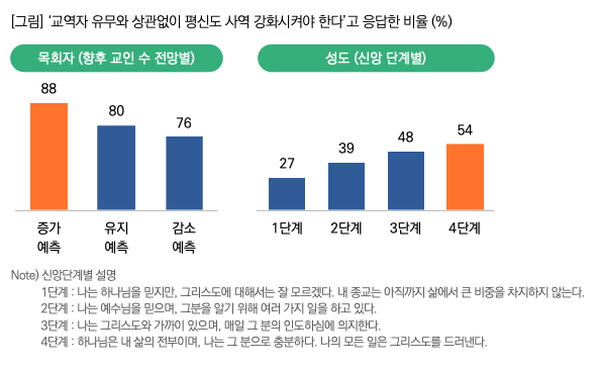 교인 수가 늘어날 것으로 예상되는 교회일수록 평신도 사역 강화에 더 높은 찬성률을 보였다. 성도 가운데서도 신앙단계가 깊을수록 평신도 사역 강화에 긍정적인 응답이 많았다.