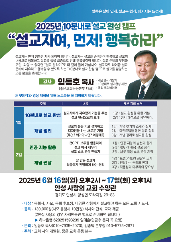 주강사는 임동호 목사가 나선다. 임 목사는 그동안 ‘오레오맵 설교’, ‘자유하는 새벽 설교’, ‘프렙 활용 설교’, ‘챗GPT 활용 설교 세미나’ 등으로 전국을 순회하며 설교 훈련을 이끌어온 ‘활용 설교 전문가’다.