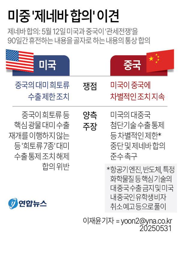 도널드 트럼프 미국 대통령은 지난 5월 30일(현지시간) 사회관계망서비스(SNS) 트루스소셜에 ‘제네바 합의’에 대해 거론한 뒤 "나쁜 소식은 중국이 우리와의 합의를 전적으로 위반했다는 것"이라고 밝혔다. 트럼프 대통령은 중국이 위반한 합의 내용이 어떤 것인지에 대해서는 언급하지 않았지만, 중국이 ‘희토류’ 수출 제한을 풀지 않고 있는데 대한 불만으로 해석된다.