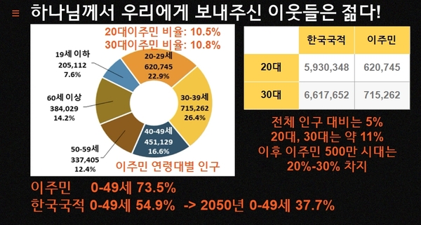 손 선교자가 제시한 자료에 따르면, 국내 체류 외국인 인구는 지난 30년간 폭발적으로 증가해 1990년 5만 명에서 2025년에는 271만 명에 이를 전망이다. 장기체류 비자를 지닌 이주민 수도 꾸준히 증가하며, 한국사회는 이미 ‘다문화사회’로 진입한 상황이다.