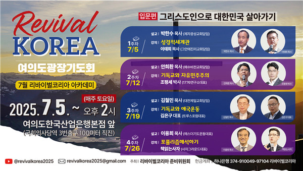 리바이벌코리아(대표 이태희 목사)가 오는 7월부터 매주 토요일 오후 2시 여의도광장기도회와 함께 ‘리바이벌코리아 아카데미’를 개강하고 말씀과 기도로 깨어 있는 성도들에게 성경적 세계관과 시대적 통찰을 제시한다.