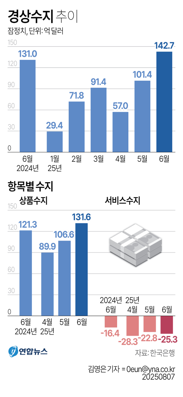 반도체 등의 수출 호조, 배당 수입 증가에 힘입어 지난 6월 우리나라 경상수지 흑자가 역대 가장 많은 143억달러에 근접하는 기록을 세웠다. 다만 철강·자동차 등의 수출은 작년 같은 기간보다 뒷걸음치는 등 점차 미국 관세 정책의 영향도 나타났다.