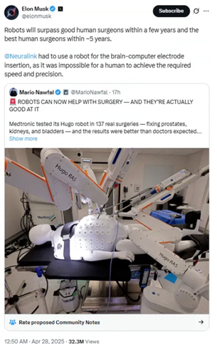 테슬라 CEO 일론 머스크는 자신의 SNS를 통해 "로봇이 5년 안에 최고의 인간 외과의사를 능가할 것"이라고 주장했다.