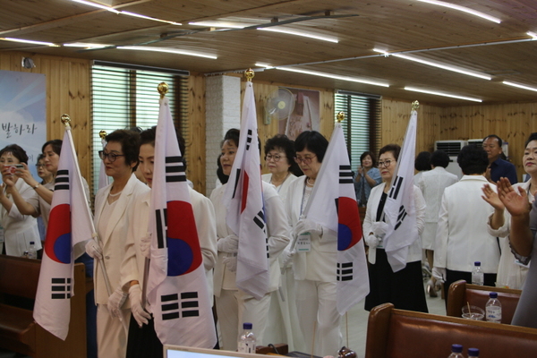 태극기를 든 기수대의 입장으로 시작된 이날 행사는 부총재 김정숙 목사의 광복절 기념사와 부총재 신숙자 목사의 축시에 이어 대표회장 우정은 목사가 기도회 취지문을 낭독했다.