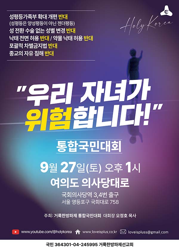 통합국민대회는 ‘우리 자녀가 위험합니다’라는 슬로건을 내걸고 △성평등가족부 확대 개편 △성전환 수술 없는 성별 변경 △낙태 전면 허용 및 약물 낙태 허용 △포괄적 차별금지법 △종교 자유 침해 반대를 위한 국민적 참여를 호소하고 있다.