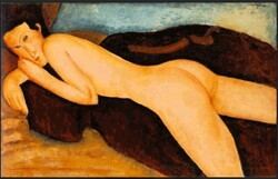 당시 누드화의 관습을 깨고 모델의 얼굴과 내면을 함께 표현한 작품으로 유명하다. 기존 서양 회화의 누드화가 관능미를 과시하는 데 그친 반면, 모딜리아니는 모델의 감정을 길고 단순화된 형태로 담아냈다. 왜곡된 신체와 비어 있는 듯한 눈은 관람자를 응시하고 있어 육체를 넘어 인물의 깊은 내면을 느끼게 한다. 이 작품은 2015년 뉴욕 크리스티 경매에서 1억7040만 달러에 낙찰되어 모딜리아니 작품 중 최고가 기록을 세웠다.