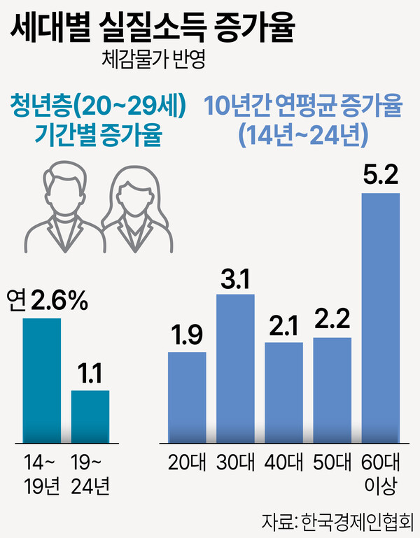 한국경제인협회(한경협)가 29일 발표한 ‘2014∼2024년 세대별 실질소득 추이 분석’ 보고서에 따르면 최근 10년간(2014∼2024년) 20대의 실질소득 증가율은 연 1.9%로, 전 세대 중 가장 낮았다. 이어 40대(2.1%), 50대(2.2%), 30대(3.1%), 60대 이상(5.2%) 순으로 나타났다. 20대는 실질소득 증가 추세도 둔화하는 모습이다. 과거 5년(2014∼2019년)의 실질소득 증가율은 연 2.6%였지만 최근 5년((2019∼2024년)은 연 1.1%를 기록하는 데 그쳤다.