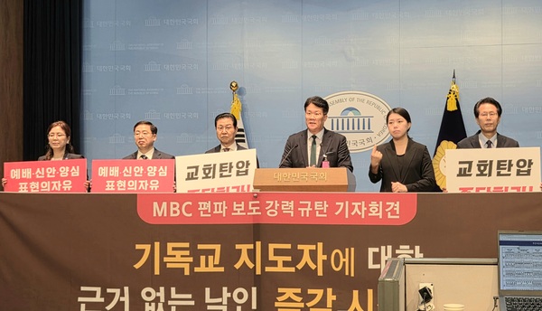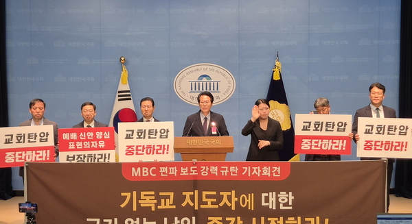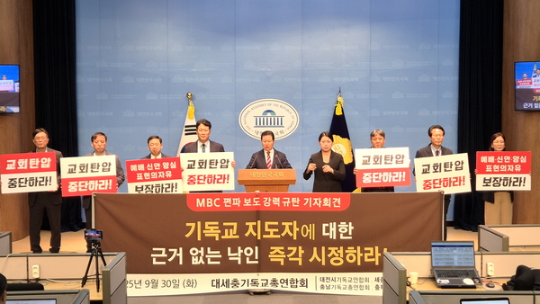 충남기독교총연합회(충남기총)와 대세충기독교총연합회(대전·세종·충남·충북기총), 서울기독교총연합회(서기총)는 30일 서울 여의도 국회 소통관에서 기자회견을 열고 MBC의 편파 왜곡 보도를 강력히 규탄했다. 사회는 이재웅 충남기총 사무총장이 맡아 진행했다.