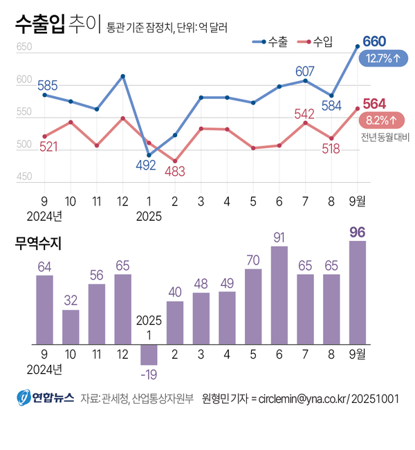 미국발 관세 충격 우려에도 불구하고 9월 한국의 수출이 사상 최대치를 경신했다. 최대 수출품 반도체가 역대 최대 수출을 기록하며 전체 실적을 견인하고, 미국 관세 타격이 있는 자동차도 역대 9월 최대 실적을 기록하며 ‘쌍끌이’를 한 덕분이다. 다만, 올해 ‘늦은 추석’의 영향으로 9월 조업일수가 증가한데다, 반도체의 경우 미국의 관세 부과 전 ‘밀어내기 수출’영향도 있는 것으로 분석된다.