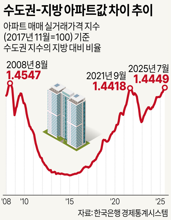 9일 한국은행 경제통계시스템에 따르면 지난 7월 아파트 매매 실거래가격 지수는 수도권과 지방이 각각 152.0, 105.2를 기록했다. 아파트 매매 실거래가격 지수는 2017년 11월을 100으로 해서 산출한 것이다. 지난 7월 수도권 지수의 지방 대비 비율은 1.4449로 지난 2008년 8월(1.4547) 이후 최고치였다. 수도권과 지방의 아파트 가격 차가 17년래 가장 크게 벌어졌다는 뜻이다.