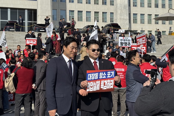 국민의힘은 12일 국회 본관 앞 계단에서 집회를 열고 ‘대장동 일당 항소 포기’를 ‘외압’이라고 규정하며 현 정부를 강하게 비판했다. 아울러 장동혁 국민의힘 대표와 송언석 원내대표는 이번 사건 진상 규명을 위한 ‘국정조사’와 ‘특검’을 촉구했다.