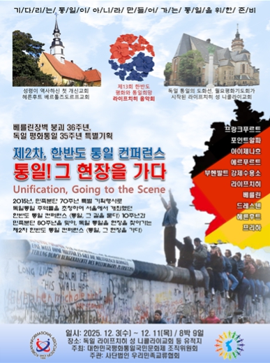 우리민족교류협회(이사장 송기학), 대한민국평화통일국민문화제 조직위원회는 오는 12월 3일부터 11일까지 독일 라이프치히 성 니콜라스교회를 비롯한 독일 통일의 주요 역사 현장에서 ‘제2차 한반도 통일 컨퍼런스 , 통일! 그 현장을 가다(Unification, Going to the Scene)’를 개최한다.