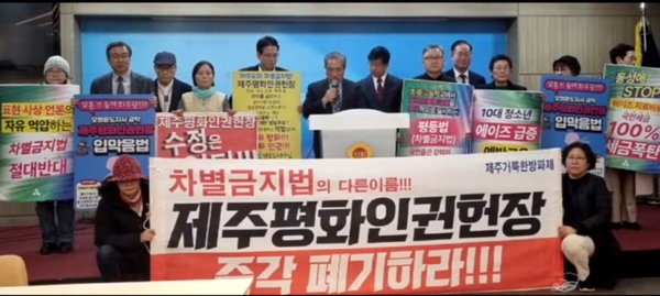 제주지역 기독교계와 보수 시민단체들이 지난 25일 제주도의회 도민카페에서 기자회견을 열어 제주도가 추진 중인 ‘제주평화인권헌장’ 제정을 강하게 반대하며 즉각 폐기를 촉구했다. 특히 같은 날 제주특별자치도청 앞에서는 이를 규탄하는 집회를 열어 반대 행동을 이어갔다.