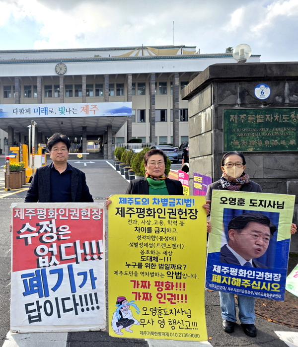 이들은 제주평화인권헌장이 사실상 선포만 남은 상태에서 도민적 공감대 형성 없이 강행되고 있다며 도민의 양심과 표현의 자유를 억압하는 편향된 인권 규범이라고 주장했다.