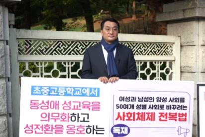 이 목사는 6일 오전 8시부터 약 1시간 동안 서울 여의도 국회의사당 6문 앞에서 1인 시위를 했다. 그는 이날 시위에서 ‘여성과 남성의 양성 사회를 50여개 성별 사회로 바꾸려는 사회체제 전복법’, ‘독재 차별금지법 결사 반대’ 등의 글이 적힌 피켓 뒤에 선 채 국회를 출입하는 국회의원 등에게 법 제정에 반대하는 의사를 나타냈다.